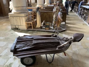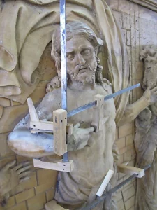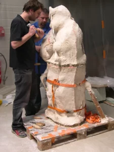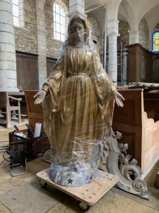 Ce constat d’état préalable permet aussi d’appréhender les conditions climatiques et d’exposition des sculptures, leur mode de fixation, ainsi que le contexte historique dans lequel elles s’inscrivent. Il aboutit, généralement, à l’élaboration d’une proposition de traitement. Alors seulement, en accord avec les responsables juridiques, le traitement peut débuter.