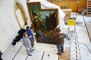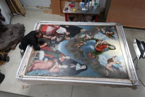 Ce secteur intervient sur les peintures de chevalet de supports variés (toile, bois ou dérivés, papier, carton, plaque de métal, etc.). Les œuvres de grand format sont également prises en charge en atelier ou in situ, selon la nature et la faisabilité des interventions préconisées. Ces pièces de grandes dimensions peuvent être des peintures intégrées aux retables, des toiles marouflées sur les parois d’un édifice, des fonds de studio photographique, des décors de théâtre, etc.